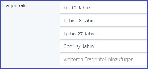 Bei mehrteiligen Fragen werden mehrere Felder für die Antwort angezeigt. Damit können zum Beispiel Mitgliederzahlen für verschiedene Altersgruppen abgefragt werden. Die Eingabefelder für die Benennung der einzelnen Antwortfelder wird angezeigt, nachdem die Frage gespeichert wurde.